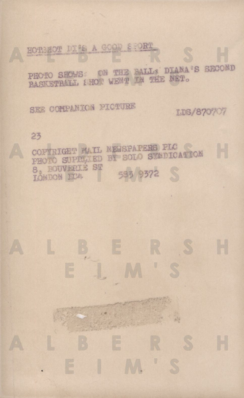Princess Diana shoots the ball as Charles watches. Obviously, she was the athlete in this coupling! This original Solo Syndication photo (5 x 8 inches) has a typed caption on the back. Nice shot Di!