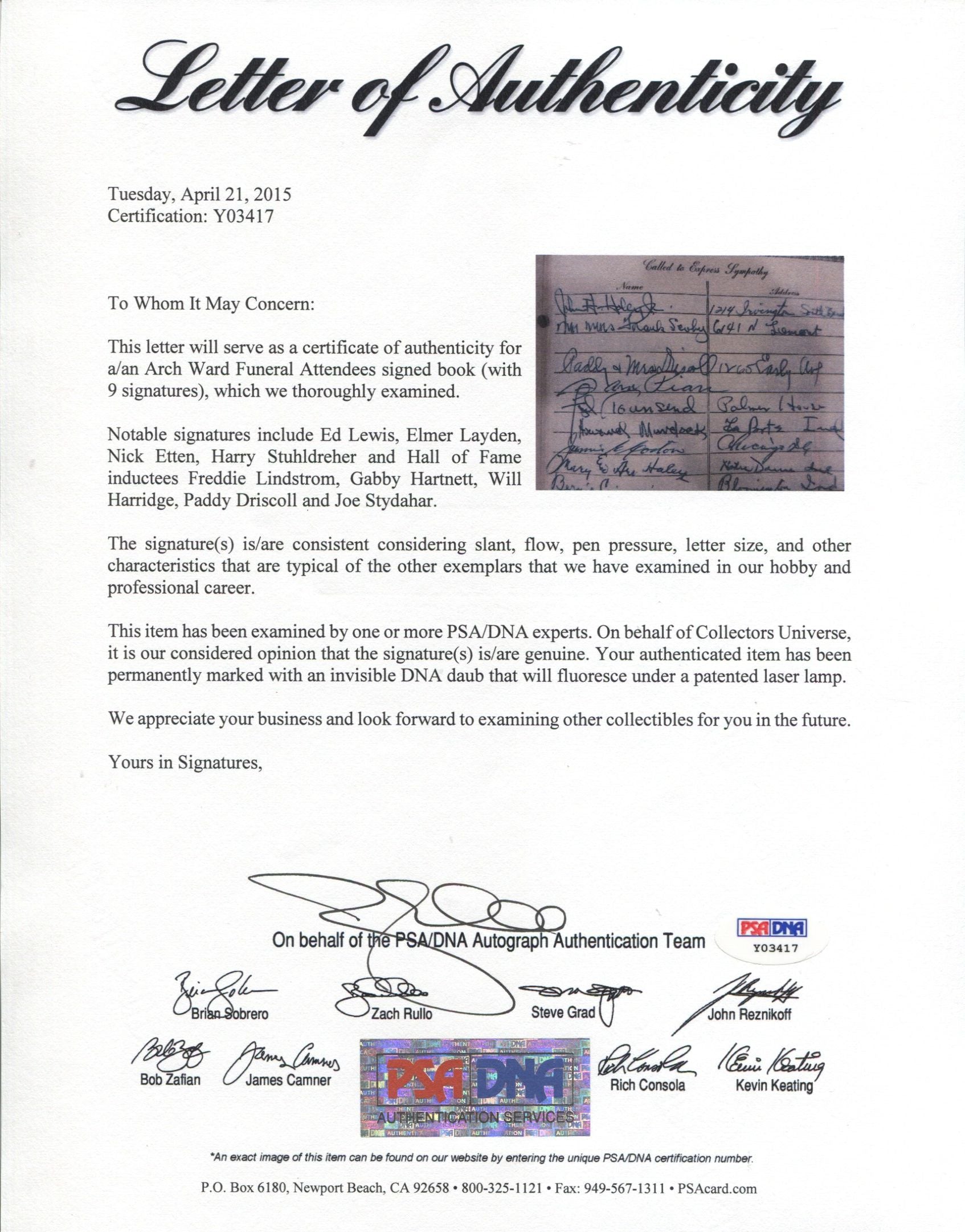 Young was an American football player, coach of football and basketball, college athletics administrator, and state legislator. He was the head football coach at DePauw University (1915), Kalamazoo College (1916-1917, 1919-1922), and Michigan Agricultural College/Michigan State College, now Michigan State University, (1923-1927). During his career as a head coach, he compiled record of 56-41-3, including an 18-22-1 mark at Michigan Agricultural/State. Young was also the head basketball coach at DePauw during the 1915-16 season and Kalamazoo from 1916 to 1923, tallying a career college basketball mark of 100-45. In addition, he served as Michigan State's first athletic director, from 1923 until 1954.The signature rates a 9/10. The page measures 6.5" x 8." Included with this item is a copy of the full LOA from PSA/DNA that covered the overall funeral book.Note: The more notable signatures have been boxed in red on the scan, but the red boxes are not present on the actual page.