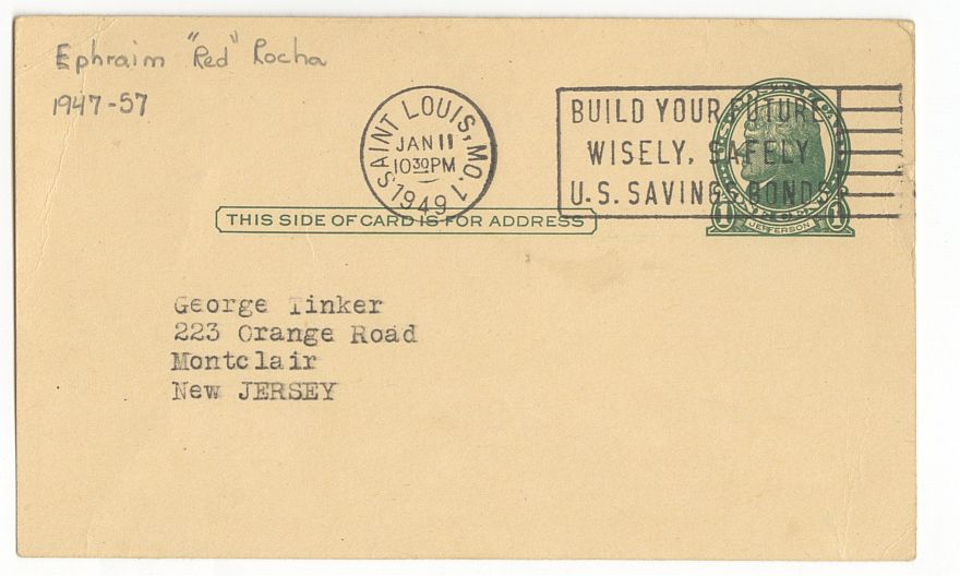 Red Rocha (D. 2010) was a 6'9" center out of Oregon State University, where he earned All-Pacific Coast Conference honors in 1945, 1946, and 1947. He was also selected as a 1947 All-American. Rocha played in the BAA and NBA in the late 1940s and early 1950s. He represented the Baltimore Bullets in the 1951 NBA All-Star Game, the first NBA All-Star Game. Rocha had 6,362 career points in the NBA and won an NBA title with the Syracuse Nationals in 1955. The first person from Hawaii to play in the NBA, Rocha still shares, with former teammate Paul Seymour, the NBA record for most minutes in a playoff game with 67. After his playing days he became a coach, including head coach of the Detroit Pistons from 1958 to 1960. Rocha also coached the Hawaii Chiefs of the American Basketball League. Rocha then became head coach for the University of Hawaii men's basketball team. At UH, he assembled what is known today as the "Fabulous Five" during the 1970 to 1972 seasons. In 1970, the team advanced to postseason play for the first time in school history.Offered is this vintage gpc signed in blue ink postmarked January 11, 1949 from St. Louis, MO