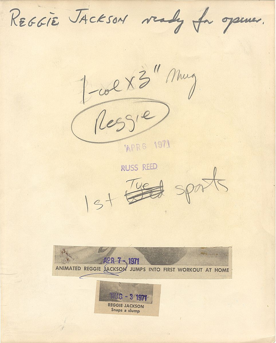 Offered is an original 8" x 10" photo taken by noted Bay Area photographer, Russ Reedstamped April 6, 7, and August 3, 1971.The photo was taken when the A's came back home from Washington D.C. (they played their first game of the season in D.C. vs. the Washington Senators) to play the White Sox for their home opening day. Great shot of Reggie getting ready to take batting practice in the A's infamous vest jerseys.
