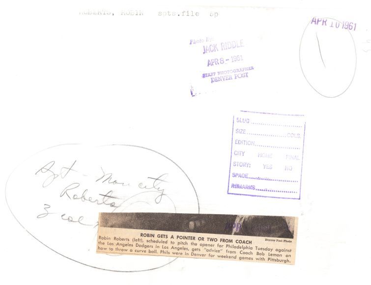 Original 10" x 7.5" photo by Jack Riddle, staff photographer of the Denver Post (stamped on back) stamped April 8 and 10, 1961 with the original newspaper caption showing Roberts getting advice from pitching coach, Bob Lemon while they were in Denver to play some games against the Pirates. Two HOF pitching legends.