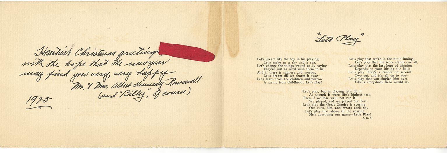 Albert Kennedy Rowswell attached himself to his hometown Pittsburgh Pirates at a young age and grew up as one of the club's biggest fans. After he achieved many a young boy's dream by becoming the Pirates' first radio broadcaster in 1936, Rowswell never lost that youthful exuberance and love for his favorite team.Rowswell, affectionately nicknamed "Rosey" by his many fans, was a former secretary at Pittsburgh's Third Presbyterian Church. He began his sports broadcast career by interviewing future Hall of Famers Max Carey, Bill McKechnie and Honus Wagner for a Red Cross fundraiser in 1922. The Pirates were one of the last teams to adopt radio, and gave Rowswell his shot at doing road games from ticker tape in 1936. By 1938, he was live on the scene at home games, a post he would joyfully serve in until his death.Rowswell was the ultimate local favorite, and just like his listeners he was unabashed about his love for the Bucs. In 1925, well before he was hired to be their radio voice, the World Champion Pirates gave Roswell a gold watch and honored him as their number one fan. His passion only amplified later behind the mic, as Commissioner Kennesaw Mountain Landis once told Rowswell, "Why, they tell me there are people living in Pittsburgh who don't even know the names of the other seven teams in the National League."During Rowswell's 18 years on the mic, the Pirates never approached a pennant, but you could hardly tell from his broadcasts. Players like Kiner, Arky Vaughn and Lloyd and Paul Waner were heroes through his voice; whether they ultimately won or lost didn't seem to matter.Fantastic piece that Rosey and his family would send out to friends and ballplayers. Picture of Rosey and his family on the cover of the card and a poem on the inside (Rosey released several books of poetry). In nice shape as this one was never sent. Measures approximately 7.5" x 5" in size.NOTE - The Pirates would beat the Washington Senators 4 games to 3 to win their second World Series.NOT FOR SALE