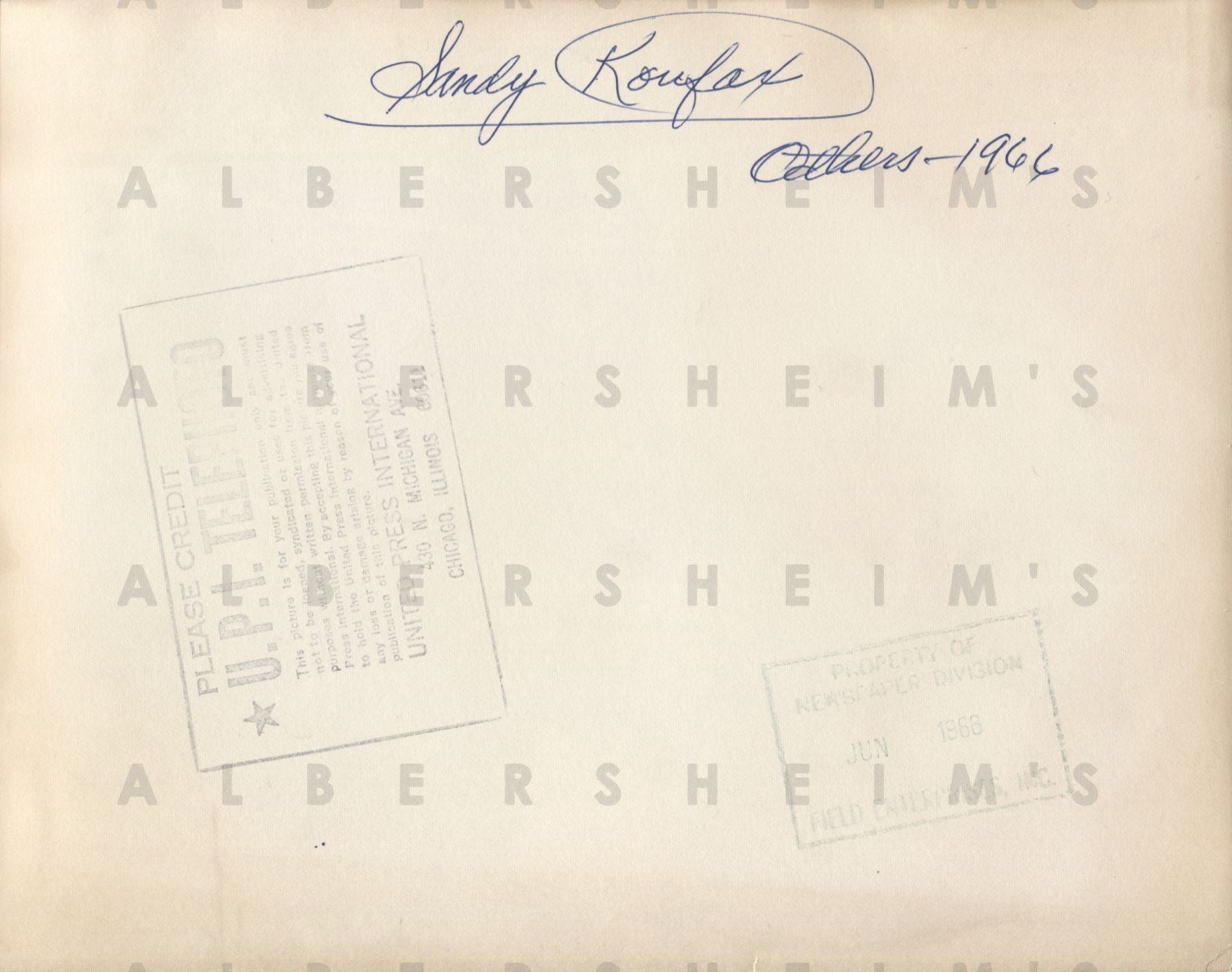 Original 9x7 UPI telephoto showing Koufax on 6/3/66 in New York with Babe Ruth award chairman Leonard Kioppet and Vice Chairman, Jack Lang. This was an award for being the Outstanding player of the 1965 World Series. UPI and Field Enterprises stamp on back.Please note that we're showing two images of the back of the photo. The lighter version is representative of the actual back of the photo while the darker version has been enhanced by our scanner so that you can view the stampings in more detail.