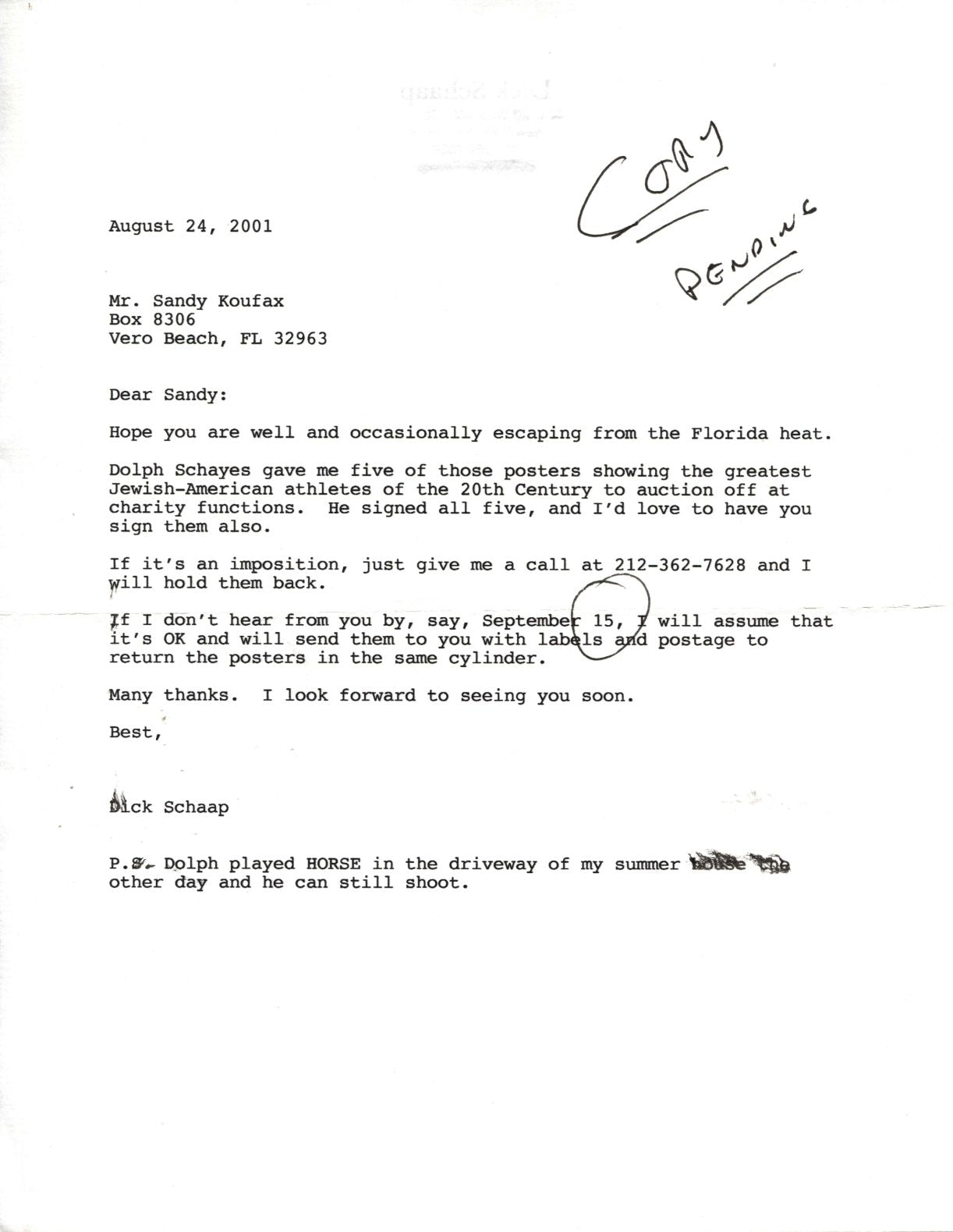 Sandy Koufax Signed Handwritten Letter to Dick Schaap's Family - ULTRA RARE