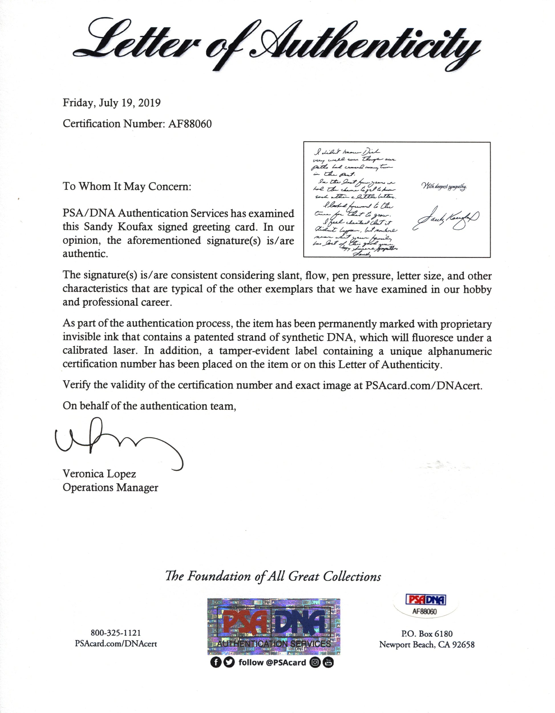 Sandy Koufax is considered one of Baseball history's greatest pitchers.He pitched twelve seasons for the Brooklyn/Los Angeles Dodgers, from 1955 to 1966. Koufax, at age 36 in 1972, became the youngest player ever inducted into the Baseball Hall of Fame. In just 12 seasons he would accomplish more than almost every Hall of Fame pitcher.Koufax is also remembered as one of the outstanding Jewish athletes in American sports. His decision not to pitch Game 1 of the 1965 World Series because it fell on Yom Kippur garnered national attention as an example of conflict between professional pressures and personal beliefs.This condolence card was sent to legendary sportswriter and author, Dick Schaap's family upon his death.Koufax has written out in black pen, "I didn't know Dick very well even though our paths crossed in the past. In the last few years we had the chance to get to know each other a little better. I looked forward to the time for that to grow, I feel cheated that it didn't happen, but nowhere near what your family has lost of good man. My sincere Sympathy Sandy."He also signed his name in full on the adjoining page of the card.In addition to the card is a typed copy of a letter that Schaap wrote Koufax asking if he would sign these 5 posters of the Greatest Jewish American Athletes of the 20th Century.And also a picture of Koufax, Don Drysdale, and Schaap all posing together.Koufax is the toughest living Baseball to find in letter format.This grouping is beyond rare.Additional PSA/DNA LOA