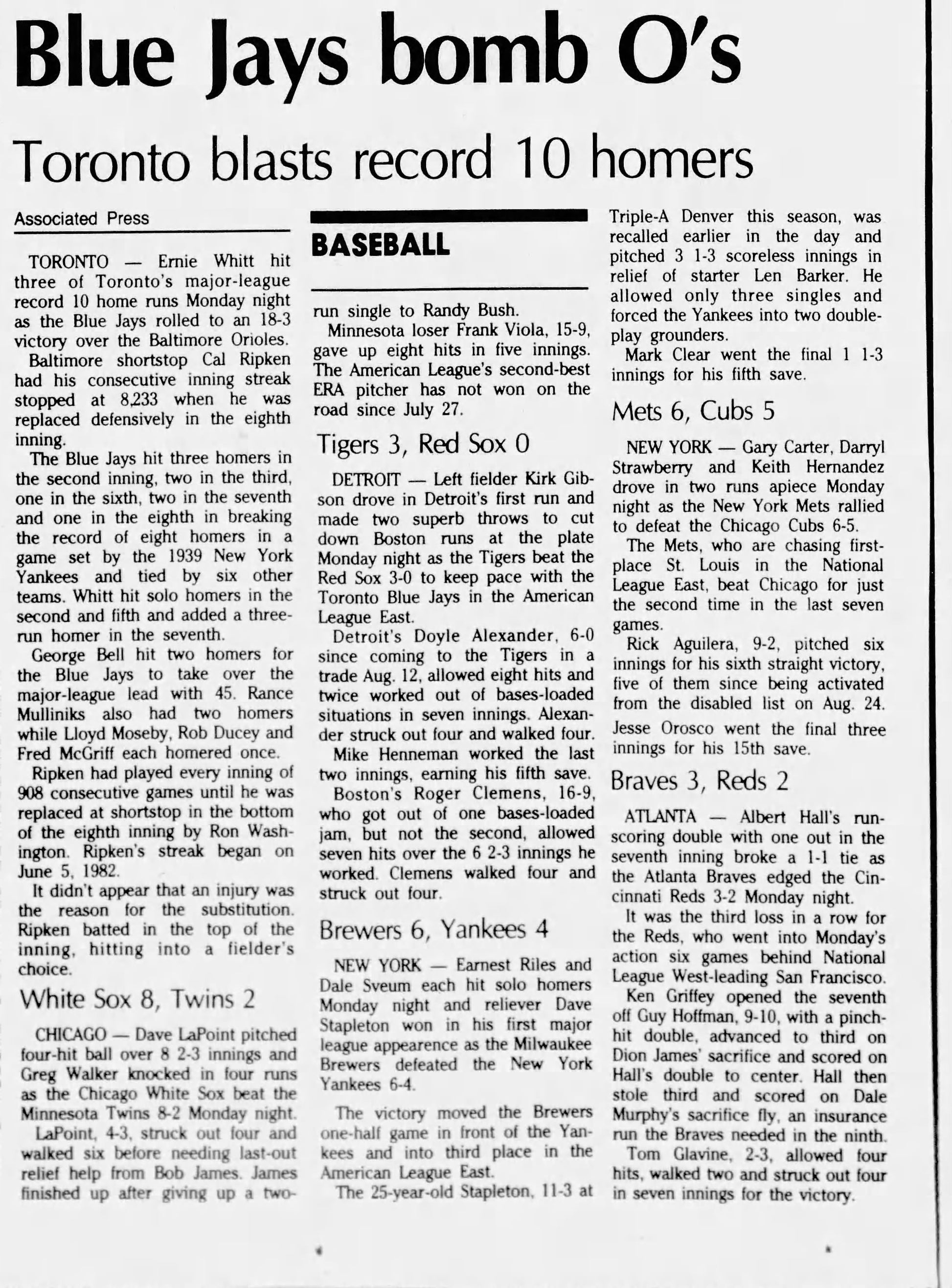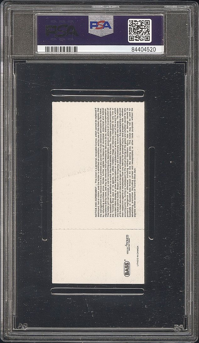 On September 14, 1987 the Blue Jays beat the visiting Baltimore Orioles 18-3 in Toronto. The Blue Jays hit a whopping 10 Home Runs in this game during their drubbing of the O's.Cal Ripken Jr.'s 2,632-consecutive-game streak is one of the most famous numbers in sports. Often forgotten is that Ripken also compiled an amazing record for consecutive innings played. Spanning June 1982 to September 1987.The streak finally ended on September 14, 1987. Ripken played the first seven innings and batted in the top of the eighth, but he was replaced in the field by future manager Ron Washington. By then, Toronto was already up 17-3 and had hit nine home runs. When Ripken's manager (who was also his father) was asked why he pulled Cal from the game, he said, "What the hell - he couldn't hit a twenty-run homer."This historic ticket stub has been graded by PSA 3 VG.This is a Pop 1 with one graded higher. Super rare!