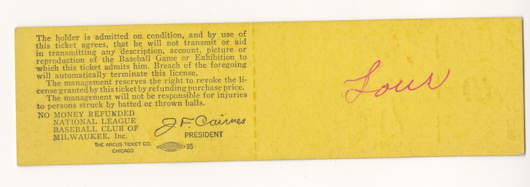 September 21, 1960 Milwaukee Braves vs. Reds Full Ticket Hank Aaron HR #217 Spahn Win 288