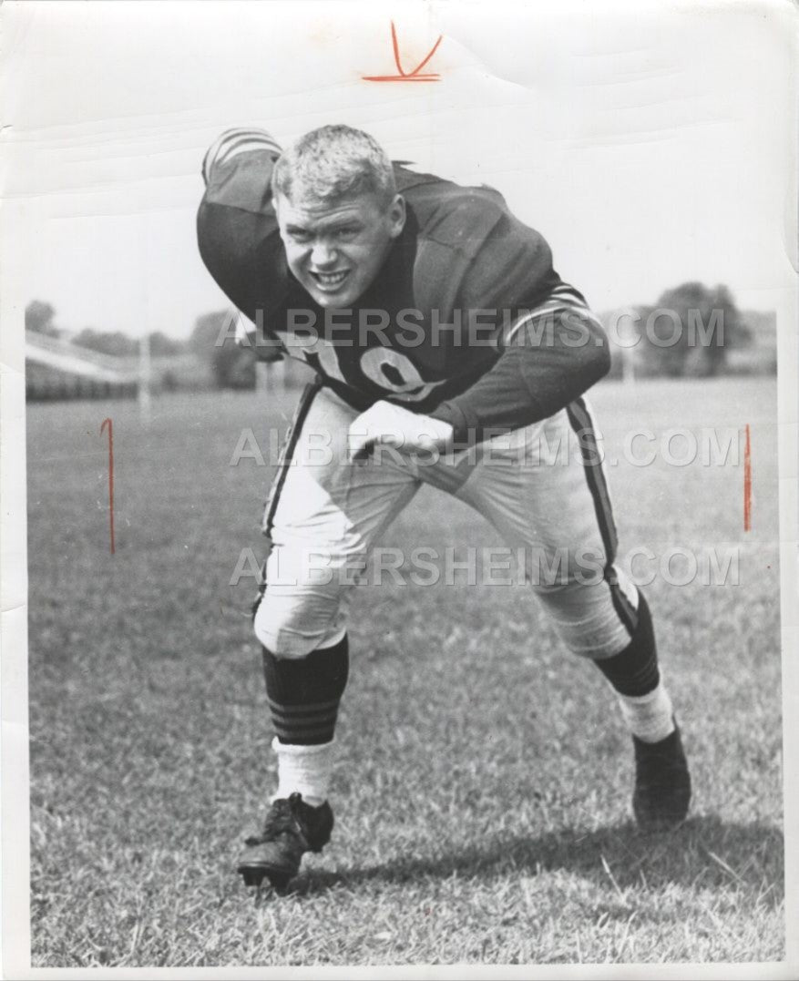 Stan Jones, a 6-1, 252-pound lineman from the University of Maryland, played 13 seasons in the National Football League, the first 12 with the Chicago Bears from 1954 to 1965 and the 1966 campaign with the Washington Redskins. He missed only two games his first 11 seasons. He was an All-NFL guard in 1955, 1956, 1959, and 1960 and played in seven straight Pro Bowls following the 1955 through 1961 seasons. When the Bears needed help on their defensive unit in 1962, assistant coach George Allen decided that Jones, with size and game intelligence, could help at defensive tackle.Offered is a TYPE original 8x10 photo stamped December 1954, his rookie year.
