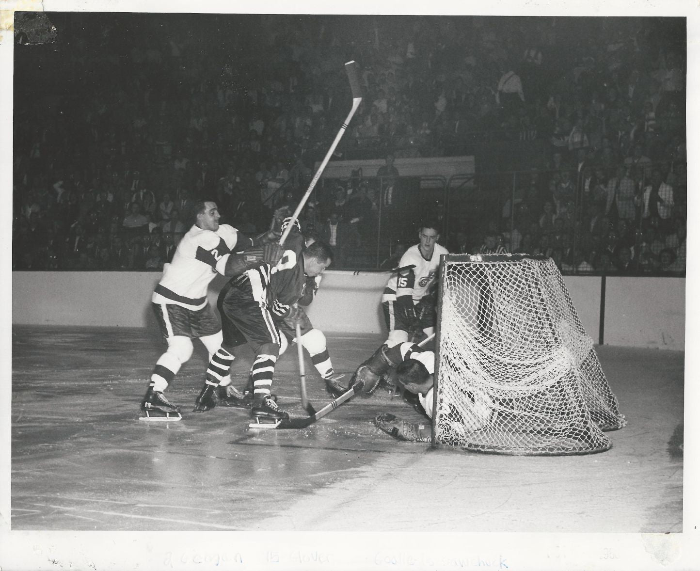Original 10x8 photo with newspaper caption attached on the back from October 5, 1960. Sawchuk is in the goal.