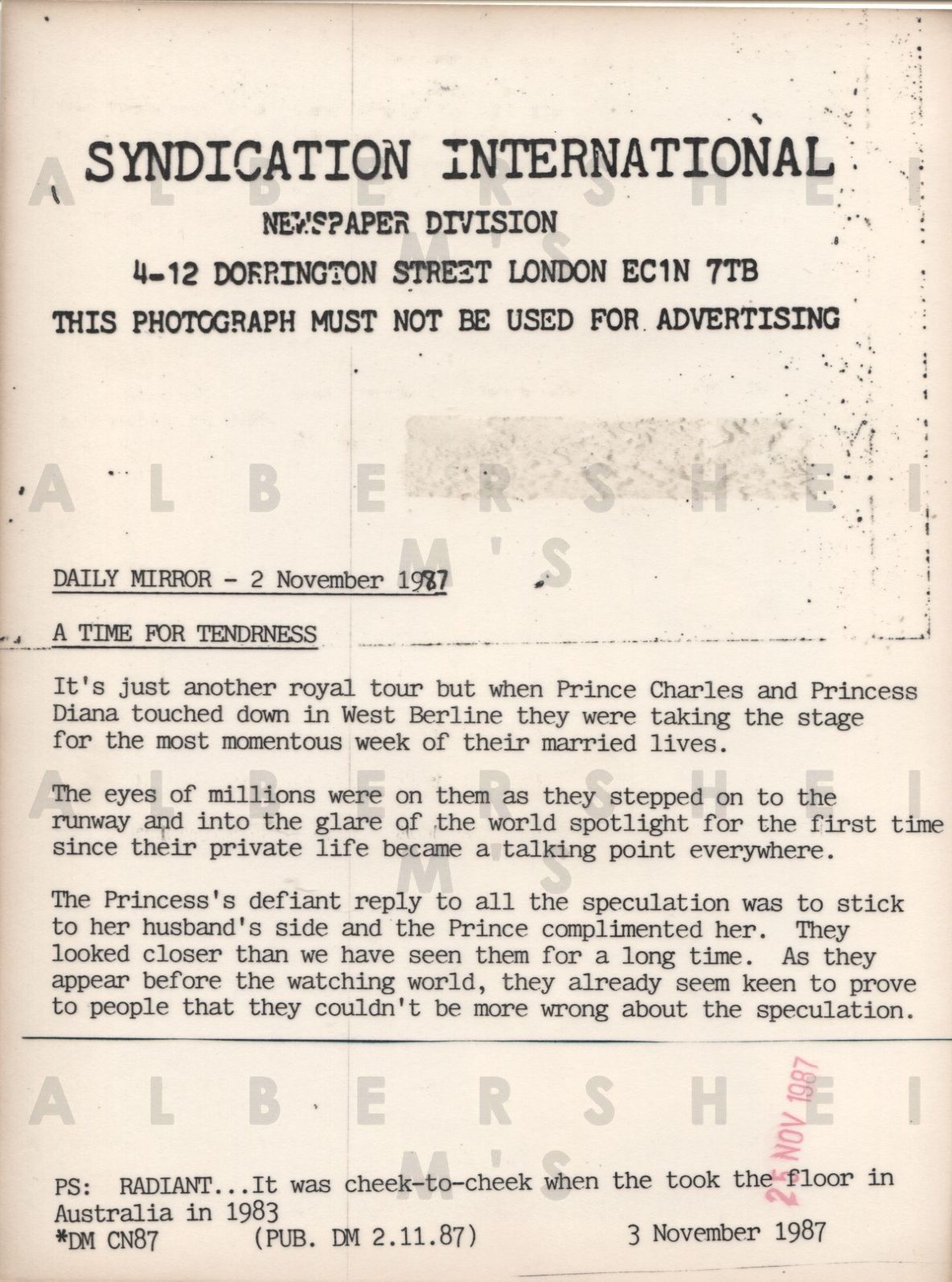 Princess Diana and Prince Charles show off their dance moves in West Berlin in this 1987 original Syndication International photo (6 x 8 inches). There's a typed caption on the back along with a Syndication International stamp. Also on the back is a date stamp of Nov 3, 1987. Nice pic of the happy couple.
