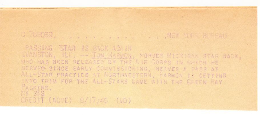 Original 7x9 Acme wire photo (with UPI stamp and paper caption attached) of Harmon in 1945 just as he got out of the service training at Northwestern to play in the College All-Star game vs the Green Bay Packers. Dated 8/17/45. The All-Stars were training at Northwestern, hence the t-shirt. Sport Stamp on back.