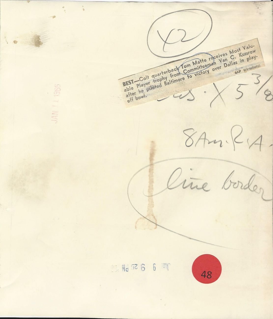 We offer an original AP wire photo with a newspaper caption on the verso stamped January 11, 1966 of Baltimore Colts legend, Tom Matte receiving the MVP trophy from committeeman Van C Kussrow after he piloted Baltimore to victory over Dallas in the Playoff Bowl. Measures 8x7 in size.