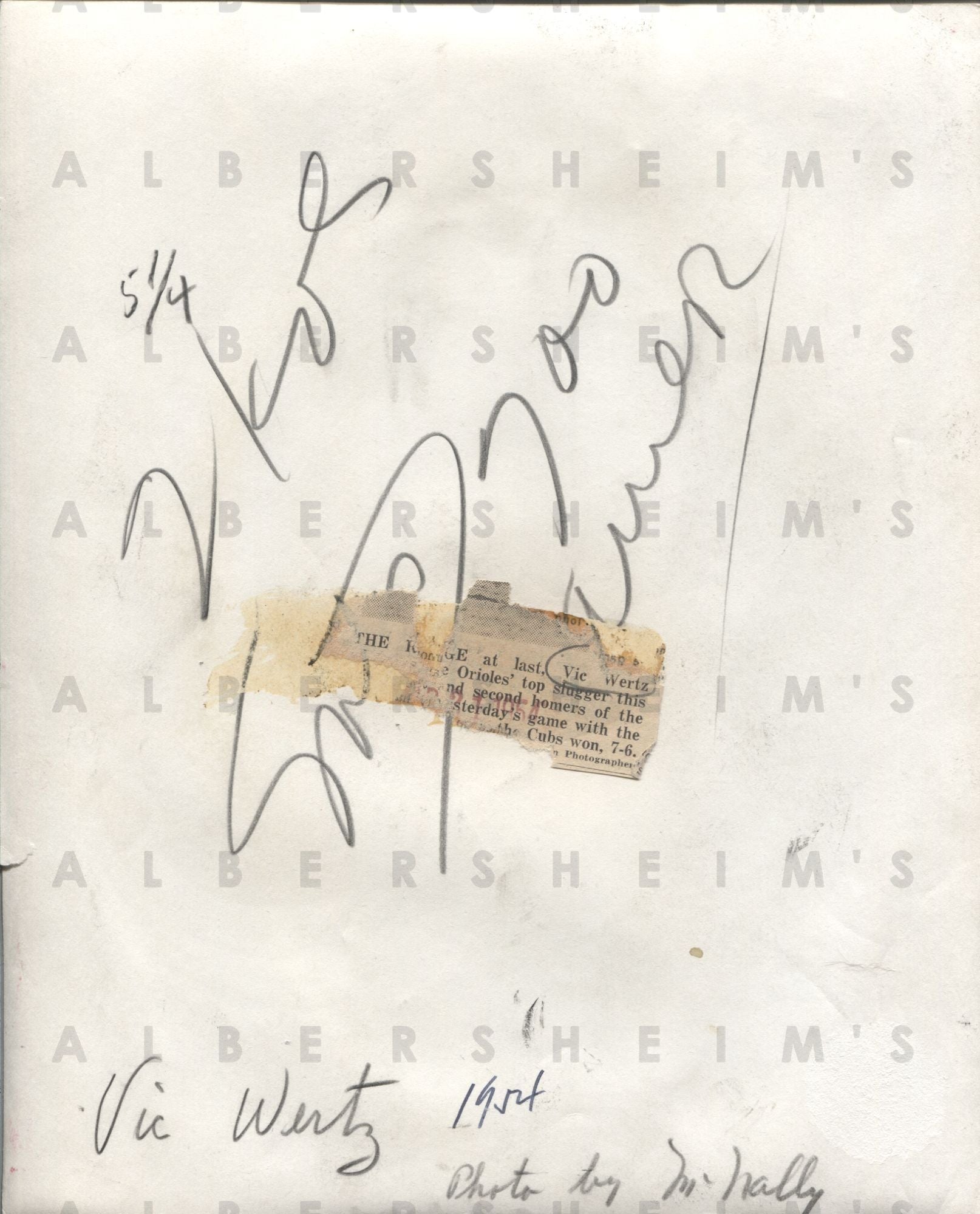 Vic Wertz was a Major League Baseball first baseman and outfielder. He had a seventeen year career from 1947 to 1963. He was signed as a free agent by the Detroit Tigers in 1942 and played for the Tigers, St. Louis Browns, Baltimore Orioles, Cleveland Indians, Boston Red Sox and Minnesota Twins, all of the American League. Wertz finished in the Top 15 in MVP voting five times: 1949 (10th), 1950 (10th), 1956 (9th), 1957 (6th), and 1960 (14th). Wertz was among the Top 10 in the American League in Home Runs in 1949 (20), 1950 (27), 1951 (27), 1952 (23), 1953 (19), 1956 (32), and 1957 (28). His 1956 total of 32 Home Runs was 2nd best in the AL. For his career, he hit 266 Home Runs and 1,178 RBIs with a.469 career slugging average and a.364 career on base percentage. He was elected to the American League All-Star team four times (1949, 1951, 1952 and 1957). He missed part of the 1955 season when stricken with a nonparalytic form of polio but returned in 1956. Wertz hit the long fly ball that Willie Mays caught in the 1954 World Series (see The Catch). It went over 450 feet to dead center of the Polo Grounds in New York, and a sportswriter said, "It would have been a home run in any other park, including Yellowstone."We offer an original 8x10 photo from the Sporting News archives with partial newspaper caption on back dated 1954 taken by McNally. Great shot!