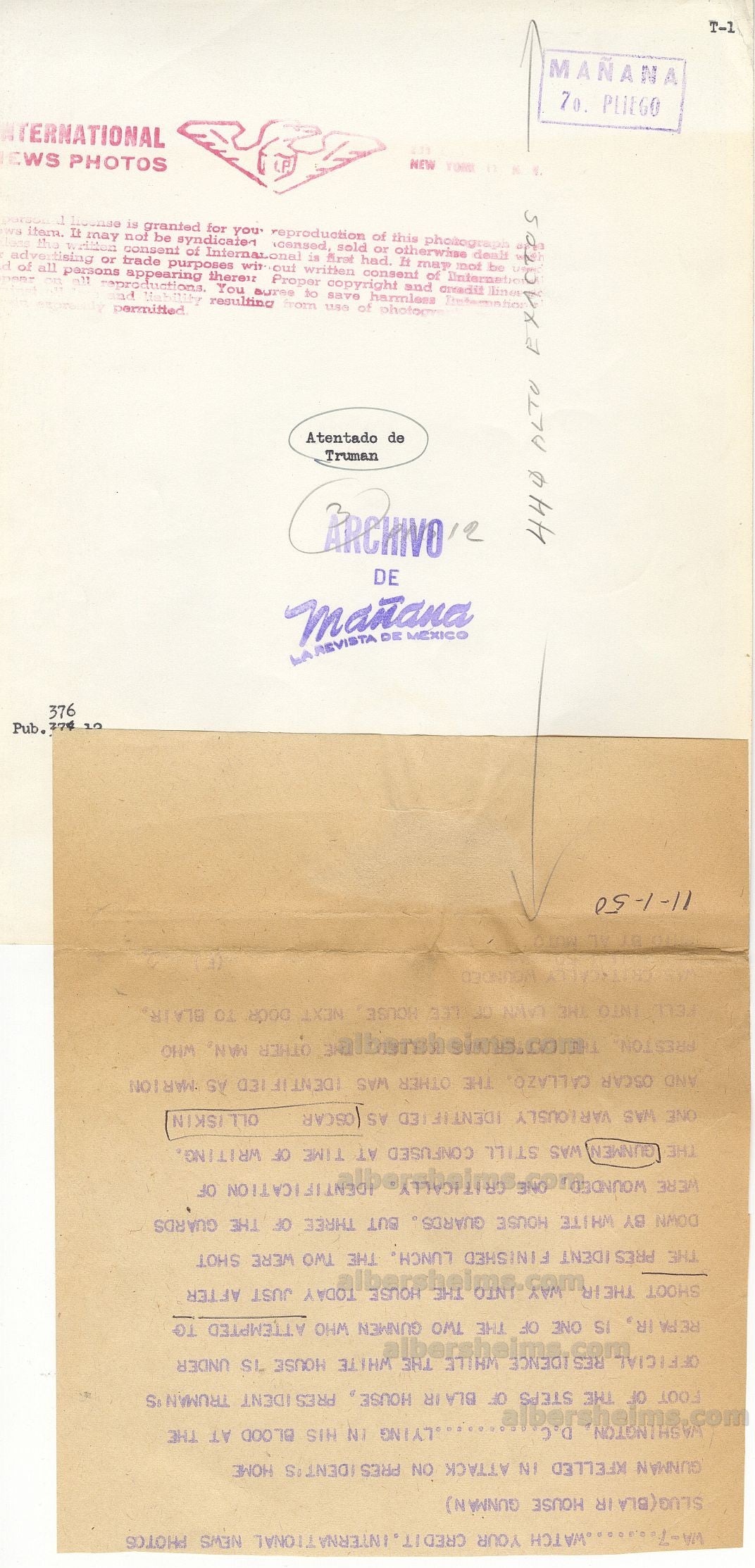 The assassination attempt on Harry Truman in 1950 occurred on November 1st, when two Puerto Rican nationalists, Oscar Collazo and Griselio Torresola, tried to storm the Blair House in Washington D.C., where Truman was residing while the White House was undergoing renovations. Their intention was to assassinate the President.Oscar Collazo and Griselio Torresola were members of the Puerto Rican Nationalist Party, which advocated for Puerto Rico's independence from the United States. They believed that by assassinating Truman, they could draw attention to their cause.On the day of the attempt, Collazo and Torresola approached Blair House armed with handguns. Secret Service agents stationed outside the residence noticed the suspicious behavior and challenged them. A shootout ensued, during which Officer Leslie Coffelt, one of the White House guards, was killed. Despite being injured, Coffelt managed to fatally shoot Torresola before succumbing to his own injuries.Collazo was wounded and captured at the scene. He was subsequently tried, convicted, and sentenced to death. However, Truman commuted his sentence to life imprisonment in consideration of his troubled background and the fact that he didn't directly participate in the shooting of Officer Coffelt. In 1979, President Jimmy Carter commuted Collazo's sentence, and he was released from prison after serving 29 years.The attempted assassination of Truman was a significant event in U.S. history, highlighting the security threats faced by the President and the lengths to which some individuals would go to advance their political agendas. It also prompted increased security measures for the protection of the President and other government officials.Offered is this historic 7" x 9" original International News TYPE 1 photograph with the original paper caption attached from November of 1950.We've never seen an original photograph from this long-forgotten assassination attempt on President Truman's life!