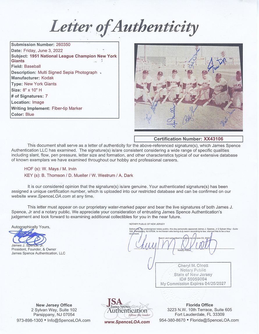Offered is a color 8x10 photo of the 1951 National Championship, New York Giants baseball stars. 6 of the 7 ballplayers pictured in the photo have signed this historic piece. All of whom are now deceased.Autographed in blue sharpie by the following players:Willie Mays(deceased) HOFWes Westrum (d. 2002)Don Mueller (D. 2011)Bobby Thomson (D. 2010)Alvin Dark (D. 2014)Monte Irvin(d. 2016)Full JSA LOA