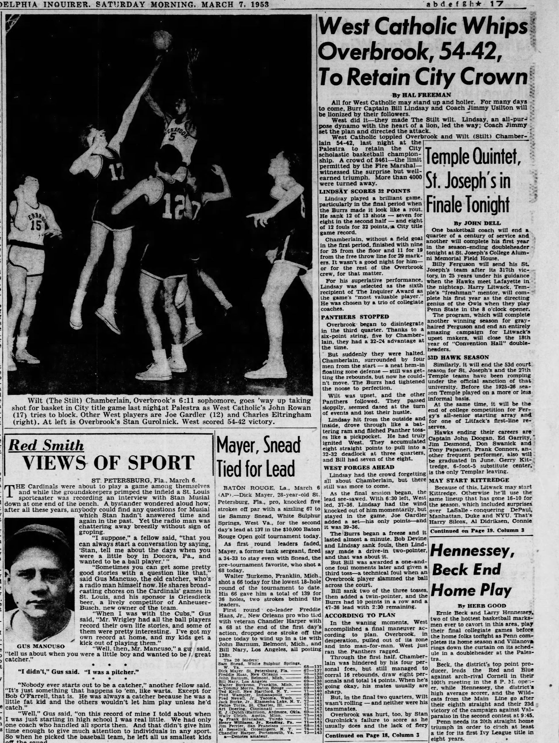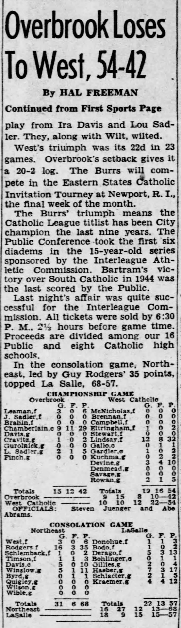 In Wilt Chamberlain's three years on the basketball team at Overbrook High School in West Philadelphia (same school that Will Smith and Seth Green would later attend); he took them to 3 City Championships.In his first year on the Varsity basketball squad in 1953 at the age of 16; they would go all the way to the City Championship (see our other ticket for the Public School title).This ticket dated March 6, 1953 is the 2ndearliest known ticket (the earliest, being from the Public School title game). from the G.O.A.T.'s basketball career.Programs have popped up over the years, but never a full ticket or ticket stub. Graded PSA 2.On March 6, 1953; Overbrook High School would play West Catholic for the City High School Championship; played at the Palaestra (University of Pennsylvania's arena).This game pitted the Champions of the Public High schools in Philadelphia against the Champions of the Catholic School League (there were very few private schools in Philly at the time other than Catholic schools).This was the first of 3 Overall City Titles that Wilt would play in (Overbrook would take the titles in 1954 & 1955; his junior and seniors years).However, during Wilt's sophomore campaign, West Catholic beat an overmatched Overbrook by a score of 54-42. Wilt was rendered somewhat ineffective with 4 men covering him. Despite this fact, the Dipper still put up 29 points despite 16 rebounds.Basically, the rest of the team self-destructed that night.In the double header, the consolation game was played by Northeast vs LaSalle (the losing teams for the Public and Catholic High School Championships).Future Naismith Basketball Hall of Famer, and future Warriors teammate; Guy Rodgers put up 35 points for NE in a win over LaSalle.This was a seriously close game as future Naismith Basketball Hall of Famer, and future Warriors teammate; Guy Rodgers put up 26 points for the Northeast squad.SUPER DUPER RARE!!!*NOT FOR SALE*